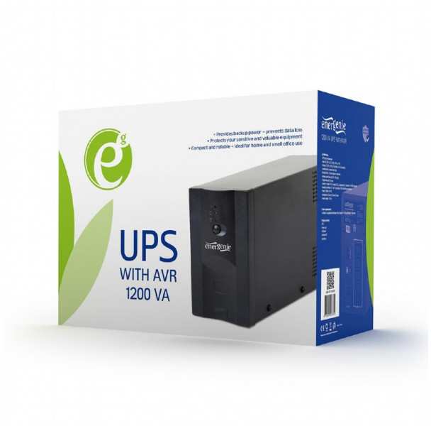 Kenmerken Automatische Ausgangsspannungsregulierung (AVR) USB Schnittstelle LED-Statusanzeige Kurzschlusssicherung Überspannungs- und Spannungsspitzenabsicherung sowie Blitzschutz Hörbare und sichtbare Alarme Absicherung vor Überladung und Tiefentladung Fax/Modem/Telefon-AnschlussschutzSpecificatiesUPS type line interactiveInput AC 162 - 295 V, 50 Hz / 60 Hz ± 10 %Output AC 188 - 254 V, 50 Hz / 60 Hz ± 0.5 % (on battery)Waveform sine wave (AC mains), simulated sine wave (battery)Temperature compensation -20mV/1 °C (per cell)Switching time no more than 5 msBackup time 2...20 mins (depends on the load)Battery sealed lead-acid 12V/7Ah x 2pcsCharge time up to 12 hoursSockets 1x input (C14), 4x output (C13 / Shuko - optional) 2x telephone RJ11 connectors 1x USB-BF connectorOperating conditions 0°C~40°C, at humidity 20~90 %RH non condensingPower 1200 VA (720 W)Dimensions 382 x 222 x 124 mmProduct weight 10.4 kg'Cold-start' functionSystemeisenSoftware is compatible with Windows 7, Windows 2008 server, Windows 8/10In order to work correclty, the connected load should be at least 5% of the maximum capacity of the UPS. For example, a 700 W UPS needs at least a connected load of 35 W to work.InhoudUPSPower cordUSB cableSoftware CDSpare fuse