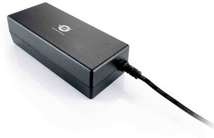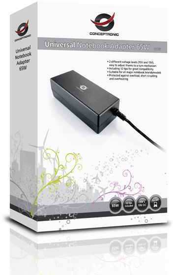 Conceptronic Universal Notebook Adapter 65w. Input voltage 100-240 V, Output power 65 W. Power supply type Indoor, Purpose Notebook, Power protection features Overheating, Overload, Short circuit. Product colour Black. Package width 140 mm, Package depth 40 mm, Package height 250 mm. Width 46 mm, Depth 107 mm, Height 30 mm