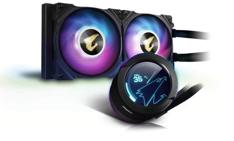 Gigabyte AORUS WATERFORCE X 240. Type All-in-one liquid cooler, Fan diameter 12 cm, Maximum airflow 60.07 cfm, Minimum air pressure 0.25 mmH2O, Maximum air pressure 3.14 mmH2O. Product colour Black
