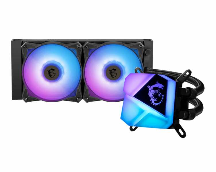 MSI MAG CORELIQUID C240 Liquid CPU Cooler '240mm Radiator, 2x 120mm ARGB PWM Fan, ARGB lighting, Center Supported, Compatible with Intel and AMD Platforms, Latest LGA 1700 ready'. Type All-in-one liquid cooler, Maximum airflow 78.73 cfm. Product colour Black