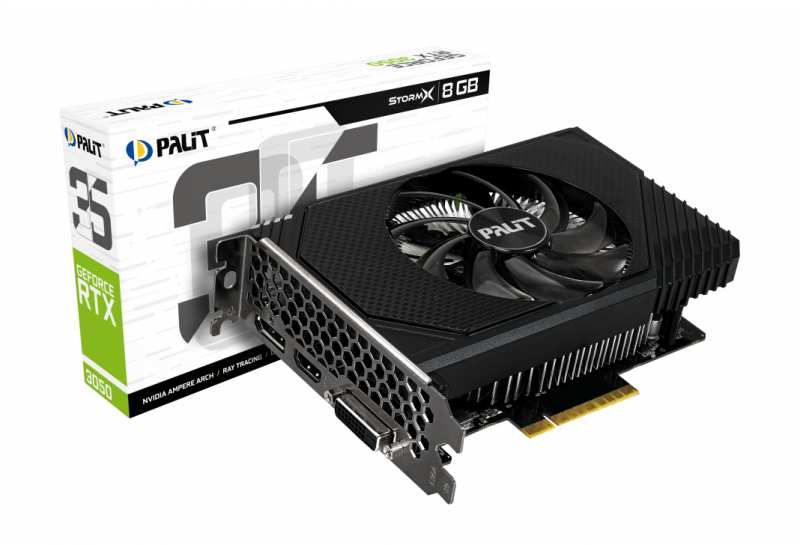 Palit GeForce RTX 3050 StormX. Graphics processor family NVIDIA, Graphics processor GeForce RTX 3050, Processor frequency 1552 MHz. Discrete graphics card memory 8 GB, Graphics card memory type GDDR6, Memory bus 128 bit. Maximum resolution 7680 x 4320 pixels. DirectX version 12 Ultimate, OpenGL version 4.6, Dual Link DVI. Interface type PCI Express 4.0. Cooling type Active, Number of fans 1 fan(s), Illumination colour Multi