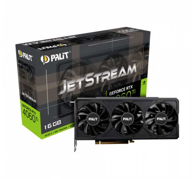 Palit NE6406T019T1-1061J. Graphics processor family NVIDIA, Graphics processor GeForce RTX 4060 Ti. Discrete graphics card memory 16 GB, Graphics card memory type GDDR6, Memory bus 128 bit, Memory clock speed 2310 MHz. Maximum resolution 7680 x 4320 pixels. DirectX version 12 Ultimate, OpenGL version 4.6. Interface type PCI Express 4.0. Cooling type Active, Number of fans 3 fan(s)