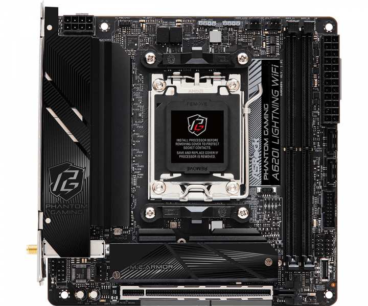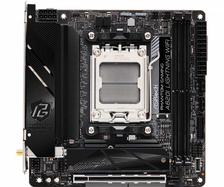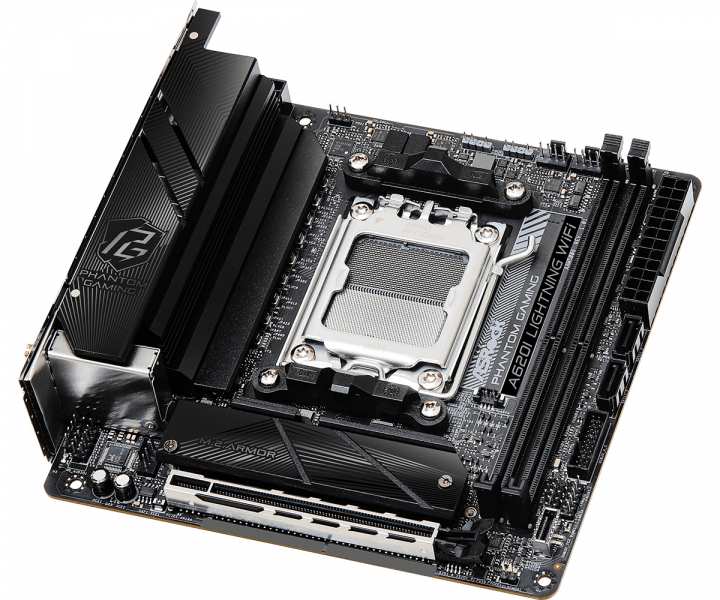 Asrock A620I Lightning WiFi. Processor manufacturer AMD, Processor socket Socket AM5, Compatible processor series AMD Ryzen 5 7th gen, AMD Ryzen 7 7th Gen, AMD Ryzen 9 7th Gen. Supported memory types DDR5-SDRAM, Maximum internal memory 96 GB, Memory slots type DIMM. Supported storage drive interfaces M.2, SATA III, Supported storage drive types HDD & SSD, RAID levels 0, 1, 10. Graphics card family AMD, Graphics card AMD RDNA 2, Maximum resolution 3840 x 2160 pixels. Ethernet interface type 2.5 Gigabit Ethernet, LAN controller Dragon RTL8125BG, Top Wi-Fi standard Wi-Fi 6E (802.11ax)
