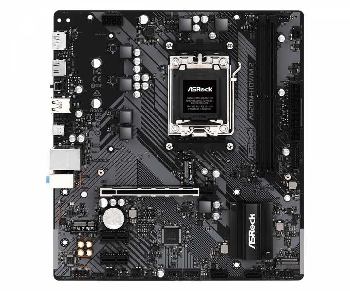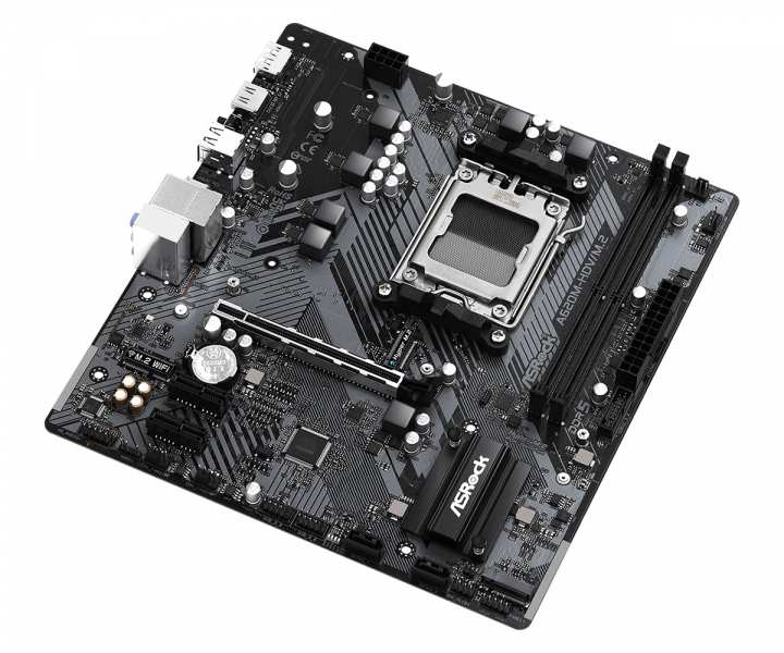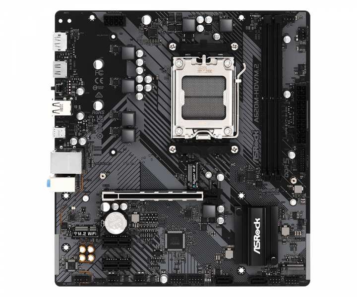 Asrock A620M-HDV/M.2. Processor manufacturer AMD, Processor socket Socket AM5, Compatible processor series AMD Ryzen 9 7th Gen. Supported memory types DDR5-SDRAM, Maximum internal memory 96 GB, Memory slots type DIMM. Supported storage drive interfaces M.2, SATA III, Supported storage drive types HDD & SSD, RAID levels 0, 1, 10. Ethernet interface type Gigabit Ethernet, LAN controller Realtek RTL8111H. Component for PC, Motherboard form factor micro ATX, Motherboard chipset family AMD