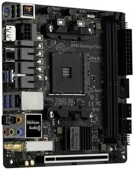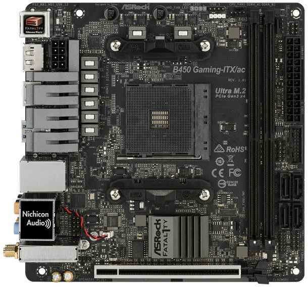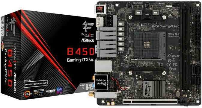 Asrock Fatal1ty B450 Gaming-ITX/ac. Supported memory types DDR4-SDRAM, Memory slots type DIMM, Supported memory clock speeds 2400,2667 MHz. Processor manufacturer AMD, Compatible processor series AMD Ryzen, Processor socket Socket AM4. Ethernet interface type Gigabit Ethernet, LAN controller Intel I211AT, Wi-Fi standards IEEE 802.11a,IEEE 802.11ac,IEEE 802.11b,IEEE 802.11g,IEEE 802.11n. Component for PC, Motherboard chipset family AMD, Motherboard chipset AMD B450. Graphics adapter family AMD, Maximum resolution 4096 x 2160 pixels
