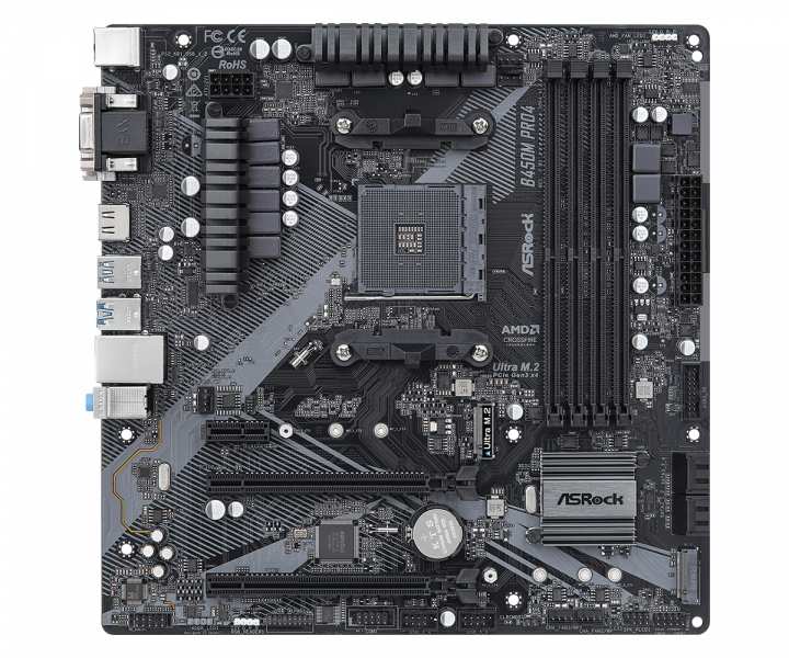 Asrock B450M Pro4 R2.0. Processor manufacturer AMD, Processor socket Socket AM4, Compatible processor series AMD Ryzen 3, AMD Ryzen 5, AMD Ryzen 7. Supported memory types DDR4-SDRAM, Maximum internal memory 128 GB, Memory slots type DIMM. Supported storage drive interfaces M.2, PCI Express 3.0, SATA III, Supported storage drive types HDD & SSD, RAID levels 0, 1, 10. Parallel processing technology support CrossFireX, Quad-GPU CrossFireX, Graphics card family AMD, Maximum resolution 4096 x 2160 pixels. USB connector type USB Type-A, USB Type-C