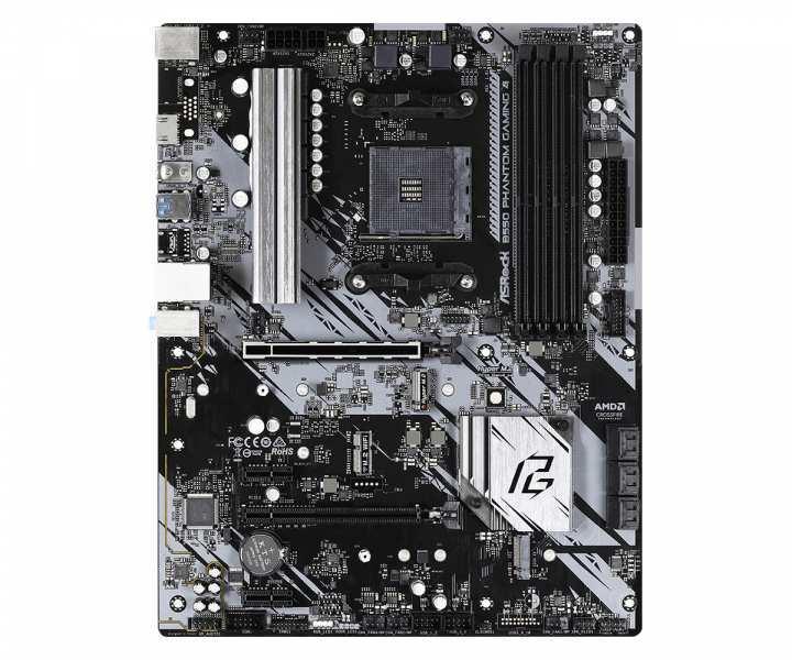 Asrock B550 Phantom Gaming 4. Processor manufacturer AMD, Processor socket Socket AM4, Compatible processor series AMD Ryzen. Supported memory types DDR4-SDRAM, Memory slots type DIMM, Supported memory clock speeds 2133,2400,2667,2933,3200,3466,3600,3733,3800,3866,4000,4133,4200,4266,4333,4400,4466,4533 MHz. Supported storage drive interfaces M.2,Serial ATA III. Ethernet interface type Gigabit Ethernet, LAN controller Realtek RTL8111H. Component for PC, Motherboard form factor ATX, Motherboard chipset family AMD