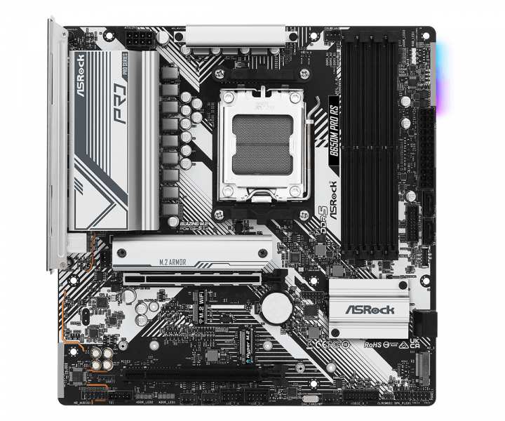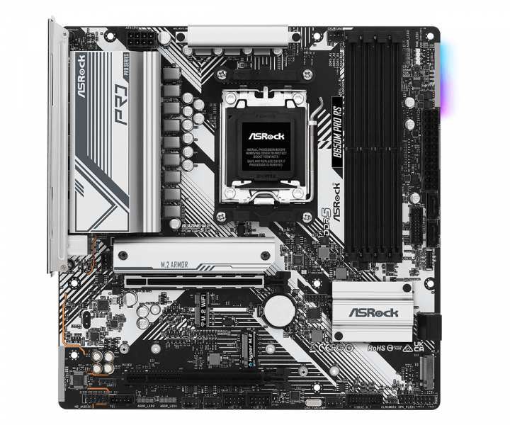 Asrock B650M Pro RS. Processor manufacturer AMD, Processor socket Socket AM5, Compatible processor series AMD Ryzen 5, AMD Ryzen 7. Supported memory types DDR5-SDRAM, Maximum internal memory 128 GB, Memory slots type DIMM. Supported storage drive interfaces M.2, SATA III. Ethernet interface type 2.5 Gigabit Ethernet, LAN controller Dragon RTL8125BG. Component for PC, Motherboard form factor micro ATX, Motherboard chipset family AMD