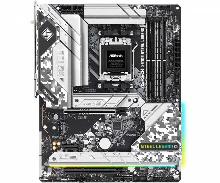 Asrock X670E Steel Legend. Processor manufacturer AMD, Processor socket Socket AM5, Compatible processor series AMD Ryzen 7 7th Gen. Supported memory types DDR5-SDRAM, Maximum internal memory 128 GB, Memory slots type DIMM. Supported storage drive interfaces M.2, SATA III, Supported storage drive types HDD & SSD, RAID levels 0, 1, 10. Parallel processing technology support Crossfire. Ethernet interface type 2.5 Gigabit Ethernet, Gigabit Ethernet, LAN controller Dragon RTL8125BG, Realtek RTL8111, Top Wi-Fi standard Wi-Fi 6E (802.11ax)