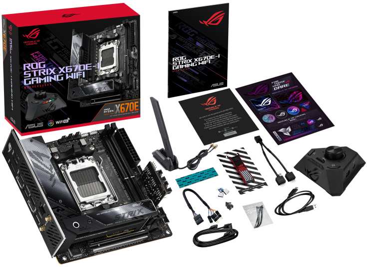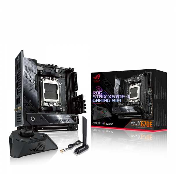 ASUS ROG STRIX X670E-I GAMING WIFI. Processor manufacturer AMD, Processor socket Socket AM5. Supported memory types DDR5-SDRAM, Maximum internal memory 64 GB, Memory slots type DIMM. Supported storage drive interfaces M.2, SATA III, Supported storage drive types HDD & SSD. Maximum resolution 3840 x 2160 pixels. Ethernet interface type 2.5 Gigabit Ethernet, Fast Ethernet, Gigabit Ethernet, LAN controller Intel I225-V, Top Wi-Fi standard Wi-Fi 6E (802.11ax)