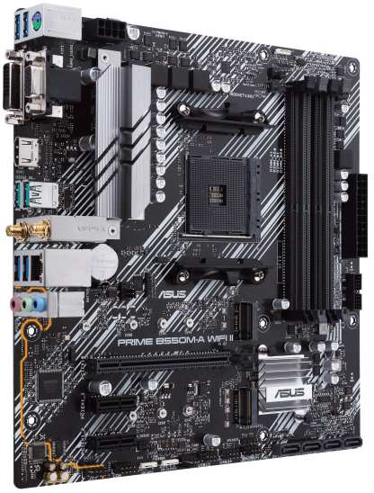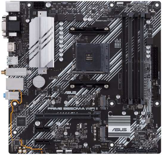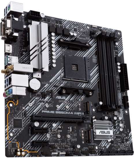 ASUS PRIME B550M-A WIFI II. Processor manufacturer AMD, Processor socket Socket AM4, Compatible processor series AMD Ryzen 3, AMD Ryzen 5, AMD Ryzen 7, 3rd Generation AMD Ryzen 9, AMD Ryzen 9 5th Gen. Supported memory types DDR4-SDRAM, Maximum internal memory 128 GB, Memory slots type DIMM. Supported storage drive interfaces M.2,PCI Express 3.0,PCI Express 4.0,SATA III, Supported storage drive types HDD & SSD. USB connector type USB Type-A. Ethernet interface type Gigabit Ethernet, LAN controller Realtek RTL8111H, Top Wi-Fi standard Wi-Fi 6 (802.11ax)