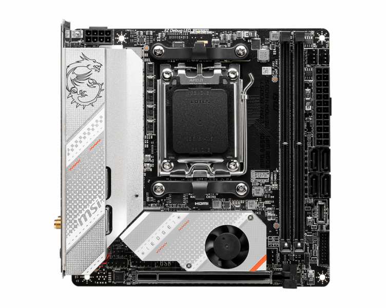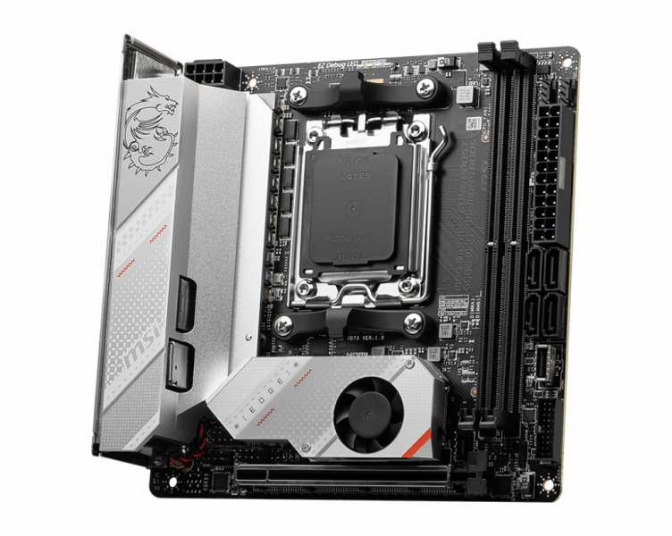 MSI MPG B650I EDGE WIFI. Processor manufacturer AMD, Processor socket Socket AM5, Compatible processor series AMD Ryzen 7 7th Gen, AMD Ryzen 9 7th Gen. Supported memory types DDR5-SDRAM, Maximum internal memory 64 GB, Supported memory clock speeds 4800,5000,5200,5400,5600,5800,6000,6200,6400 MHz. Supported storage drive interfaces M.2, SATA, RAID levels 0, 1, 10. Ethernet interface type 2.5 Gigabit Ethernet, LAN controller Realtek RTL8125B, Top Wi-Fi standard Wi-Fi 6E (802.11ax). Component for PC, Motherboard form factor mini ATX, Motherboard chipset family AMD