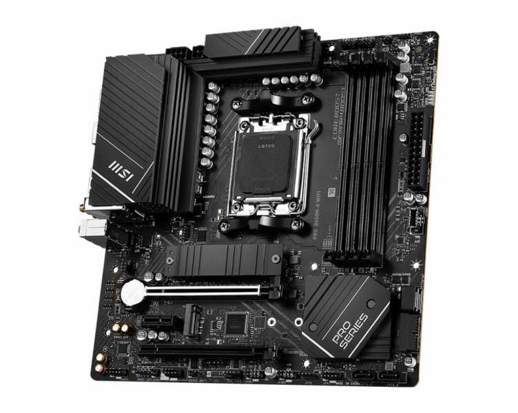 MSI PRO B650M-A WIFI. Processor manufacturer AMD, Processor socket Socket AM5, Compatible processor series AMD Ryzen 7 7th Gen, AMD Ryzen 9 7th Gen. Supported memory types DDR5-SDRAM, Maximum internal memory 128 GB, Supported memory clock speeds 4800,5000,5200,5400,5600,5800,6000,6200,6400 MHz. Supported storage drive interfaces M.2, SATA, RAID levels 0, 1, 10. Ethernet interface type 2.5 Gigabit Ethernet, LAN controller Realtek RTL8125-BG, Top Wi-Fi standard Wi-Fi 6E (802.11ax). Component for PC, Motherboard form factor micro ATX, Motherboard chipset family AMD