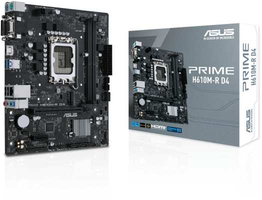 ASUS PRIME H610M-R D4. Processor manufacturer Intel, Processor socket LGA 1700, Compatible processor series Intel® Celeron®, Intel® Core i3, Intel® Core i5, Intel® Core i7, Intel® Core i9, Intel Pentium G. Supported memory types DDR4-SDRAM, Maximum internal memory 64 GB, Memory slots type DIMM. Supported storage drive interfaces M.2,SATA III, Supported storage drive types HDD & SSD. Maximum resolution 3840 x 2160 pixels. USB connector type USB Type-A
