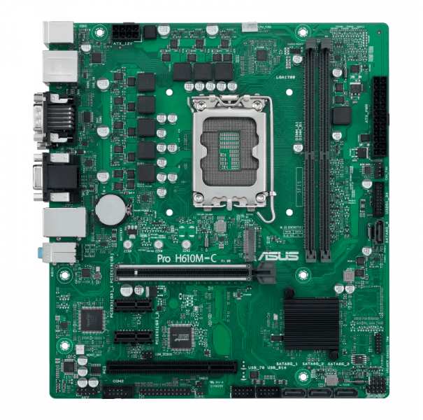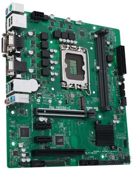 ASUS Pro H610M-C-CSM. Processor manufacturer Intel, Processor socket LGA 1700, Compatible processor series Intel® Celeron®, Intel® Core i3, Intel® Core i5, Intel® Core i7, Intel® Core i9, Intel® Pentium®. Supported memory types DDR5-SDRAM, Maximum internal memory 64 GB, Memory slots type DIMM. Supported storage drive interfaces M.2,SATA III, Supported storage drive types HDD & SSD. Ethernet interface type Gigabit Ethernet. Component for PC, Motherboard form factor micro ATX, Motherboard chipset family Intel