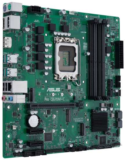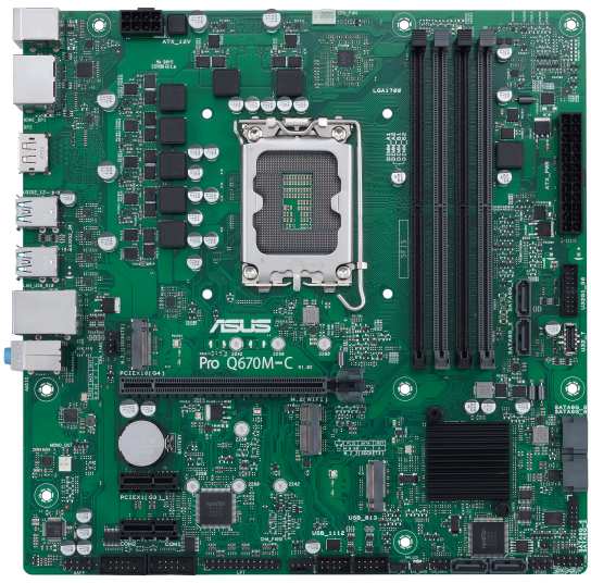 ASUS PRO Q670M-C-CSM. Processor manufacturer Intel, Processor socket LGA 1700, Compatible processor series Intel® Celeron®, Intel® Core i3, Intel® Core i5, Intel® Core i7, Intel® Core i9, Intel Pentium G. Supported memory types DDR5-SDRAM, Maximum internal memory 128 GB, Memory slots type DIMM. Supported storage drive interfaces M.2,SATA III, Supported storage drive types HDD & SSD. Ethernet interface type Gigabit Ethernet. Component for PC, Motherboard form factor micro ATX, Motherboard chipset family Intel
