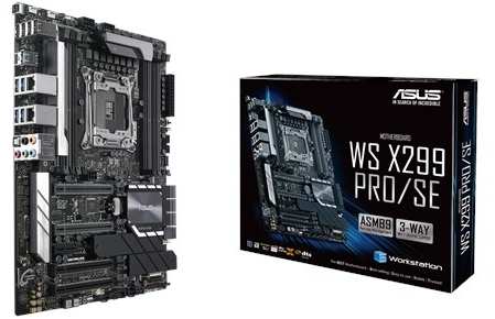 ASUS WS X299 PRO/SE. Processor manufacturer Intel, Processor socket LGA 2066, Compatible processor series Intel® Core X-series. Supported memory types DDR4-SDRAM, Memory slots type DIMM, Supported memory clock speeds 2133,2400,2666,3600,4000 MHz. Parallel processing technology support 3-Way CrossFireX,3-Way SLI. Ethernet interface type Gigabit Ethernet, LAN controller Intel® I211-AT. Component for PC, Motherboard form factor ATX, Motherboard chipset family Intel
