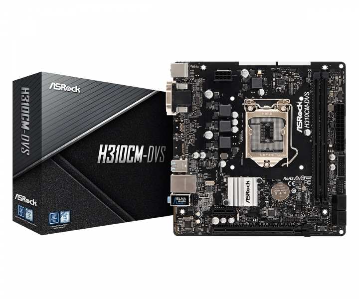 Asrock H310CM-DVS. Supported memory types DDR4-SDRAM, Memory slots type DIMM, Supported memory clock speeds 2133,2400,2666 MHz. Processor manufacturer Intel, Compatible processor series Intel® Core i3, Intel Core i5, Intel Core i7, Processor socket LGA 1151 (Socket H4). Ethernet interface type Gigabit Ethernet, LAN controller Realtek RTL8111H. Component for PC, Motherboard chipset family Intel, Motherboard chipset Intel® H310. Maximum resolution 1920 x 1200 pixels