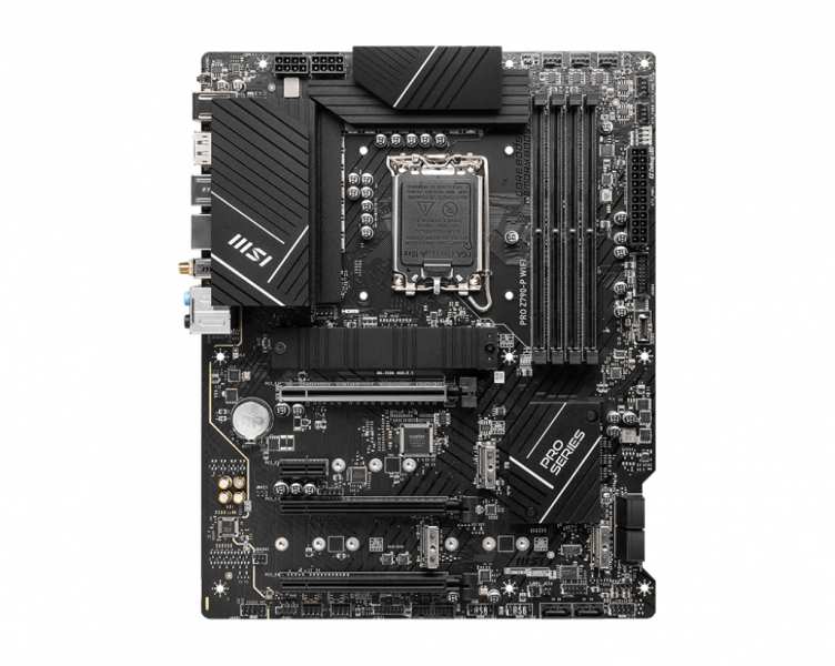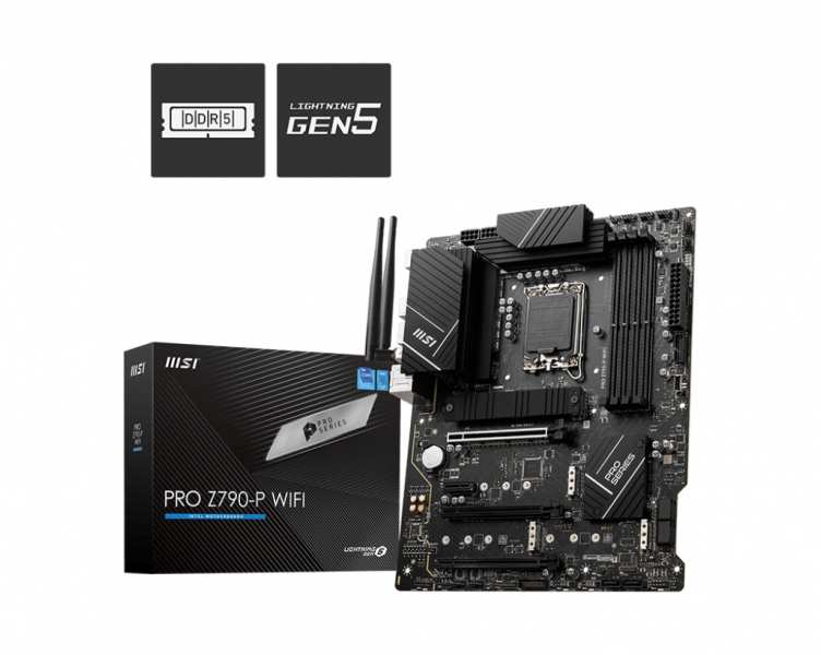 MSI PRO Z790-P WIFI. Processor manufacturer Intel, Processor socket LGA 1700, Compatible processor series Intel® Celeron®, Intel® Pentium® Gold. Supported memory types DDR5-SDRAM, Maximum internal memory 128 GB, Supported memory clock speeds 4800,5000,5200,5400,5800,6000,6400,6600,6800,7000 MHz. Supported storage drive interfaces M.2, PCI Express, Supported storage drive types HDD & SSD, Internal storage capacity 10 GB. Ethernet interface type 2.5 Gigabit Ethernet, Top Wi-Fi standard Wi-Fi 6 (802.11ax), Wi-Fi standards 802.11a, 802.11b, 802.11g, Wi-Fi 4 (802.11n), Wi-Fi 6 (802.11ax). Component for PC, Motherboard form factor ATX, Motherboard chipset family Intel