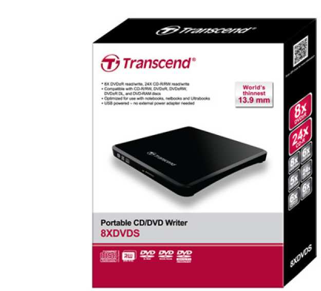 Transcend Portable DVD Writer - Black. Product colour Black. Optical drive type DVD±R/RW, Interface USB 2.0, Disc types supported CD-R,CD-RW,DVD+R,DVD+RW,DVD-RAM,DVD-RW DL. Width 13.9 mm, Depth 142.8 mm, Height 148 mm. Dimensions (WxDxH) 148 x 142.8 x 13.9 mm, Number of optical discs 1 discs