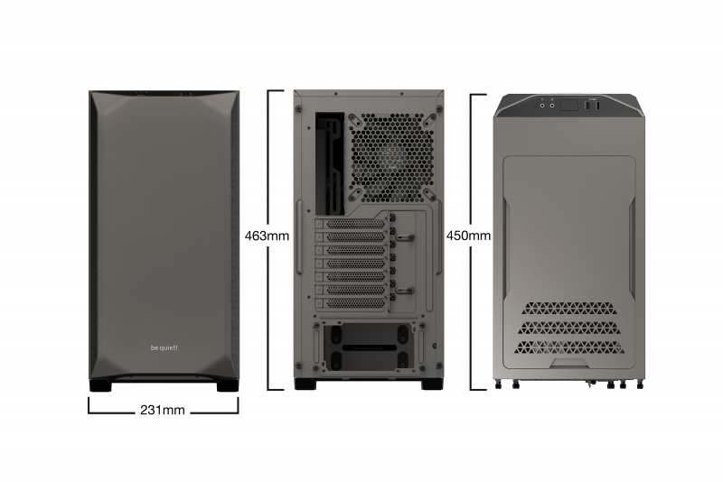 be quiet! Pure Base 500 Window Metallic Gray. Form factor Tower, Type PC, Material ABS synthetics,Steel,Tempered glass. Power supply location Bottom, Supported power supply form factors ATX,PS2. Front fans installed 1x 140 mm, Front fans diameters supported 120,140 mm, Rear fans installed 1x 140 mm. Supported HDD sizes 2.5,3.5. Width 231 mm, Depth 450 mm, Height 443 mm