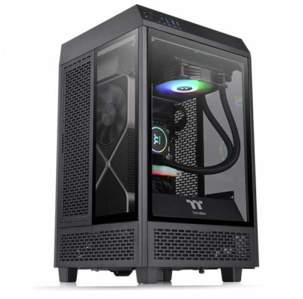Thermaltake The Tower 100. Form factor Mini Tower, Type PC, Product colour Black. Supported power supply form factors PS2. Rear fans installed 1x 120 mm, Rear fans diameters supported 120,140 mm, Top fans installed 1x 120 mm. Supported HDD sizes 2.5,3.5. Width 266 mm, Depth 266 mm, Height 462.8 mm