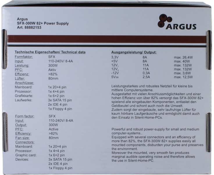 Inter-Tech SFX-300W. Total power 300 W, AC input voltage 110 - 240 V, AC input frequency 50 - 60 Hz. Motherboard power connector 20+4 pin ATX. Purpose PC, Power supply unit (PSU) form factor ATX, 80 PLUS certification 80 PLUS. Product colour Grey, Fan diameter 8 cm, Number of fans 1 fan(s). Width 125 mm, Depth 100 mm, Height 63.5 mm