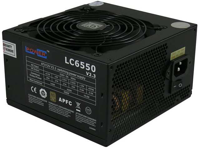 LC-Power LC6550 V2.3. Total power 550 W, AC input voltage 230 V, AC input frequency 50 Hz. Motherboard power connector 20+4 pin ATX, Motherboard power cable length 45 cm, CPU power cable length 45 cm. Purpose PC, Power supply unit (PSU) form factor ATX, 80 PLUS certification 80 PLUS Bronze. Product colour Black, Fan diameter 12 cm, Number of fans 1 fan(s). Width 150 mm, Depth 140 mm, Height 86 mm