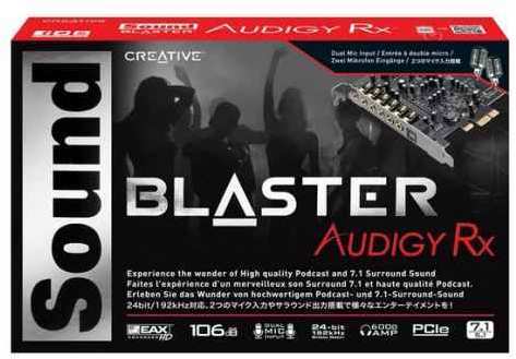 Creative Labs Sound Blaster Audigy Rx. Audio output channels 7.1 channels, Audio quality 24 bit, Line-out Signal-to-Noise Ratio (SNR) 106 dB. Host interface PCI-E. Bundled software Sound Blaster Audigy Rx Control Panel Sound Blaster EAX Studio Creative Smart Recorder Creative.... Minimum RAM 1024 MB, Minimum hard disk space 600 MB