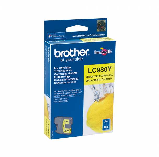 Brother LC-980Y. Type Original, Ink type Pigment-based ink, Printing colours yellow. Width 74 mm, Depth 12 mm, Height 93 mm. Package dimensions (WxDxH) 86 x 25 x 123 mm, Quantity outer carton 5 pc(s)