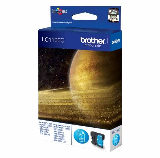 Brother LC-1100C. Type Original, Printing colours Cyan, Compatibility DCP-385C DCP-395CN DCP-585CW DCP-J615W DCP-J715W MFC-490CW MFC-790CW MFC-990CW MFC-5490CN.... Width 12 mm, Depth 74 mm, Height 93 mm. Package dimensions (WxDxH) 86 x 26 x 123 mm, Case or master carton quantity 5 pc(s), Approximate page yield (A4, colour) 325 pages