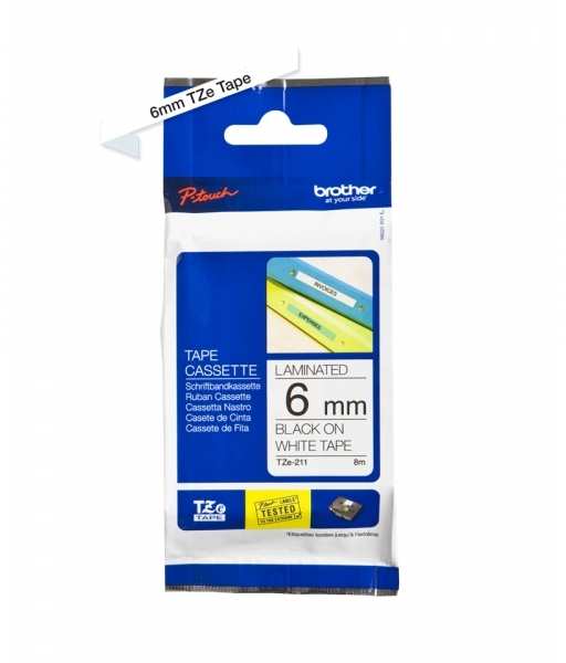 Brother TZe211. Label colour Black on white, Tape type TZe, Product colour Grey. Package type Blister. Tape width 6 mm, Tape length 8 m