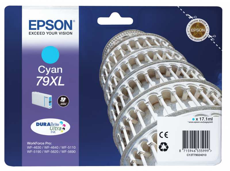 Epson Singlepack Cyan 79XL DURABrite Ultra Ink, Tower of Pisa. Type Original, Printing colours Cyan, Brand compatibility Epson. Package width 150 mm, Package depth 37 mm, Package height 195 mm. Pallet width 80 cm, Pallet length 120 cm, Pallet height 46.5 cm