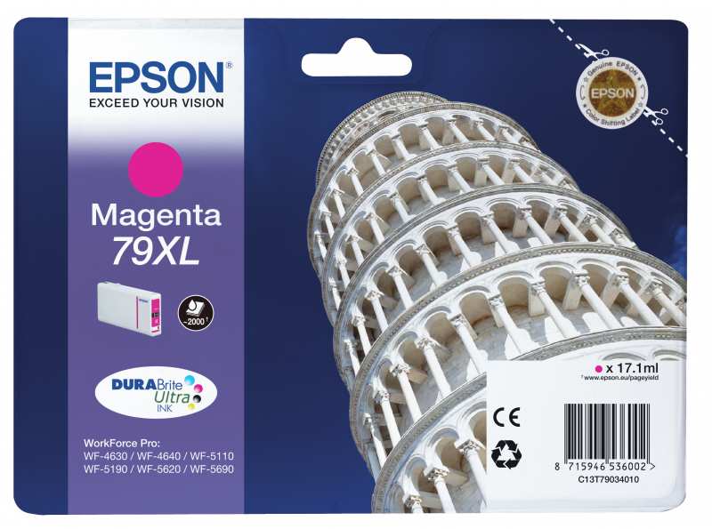 Epson Singlepack Magenta 79XL DURABrite Ultra Ink, Tower of Pisa. Type Original, Ink type Pigment-based ink, Printing colours Magenta. Package width 150 mm, Package depth 37 mm, Package height 195 mm. Pallet width 80 cm, Pallet length 120 cm, Pallet height 46.5 cm