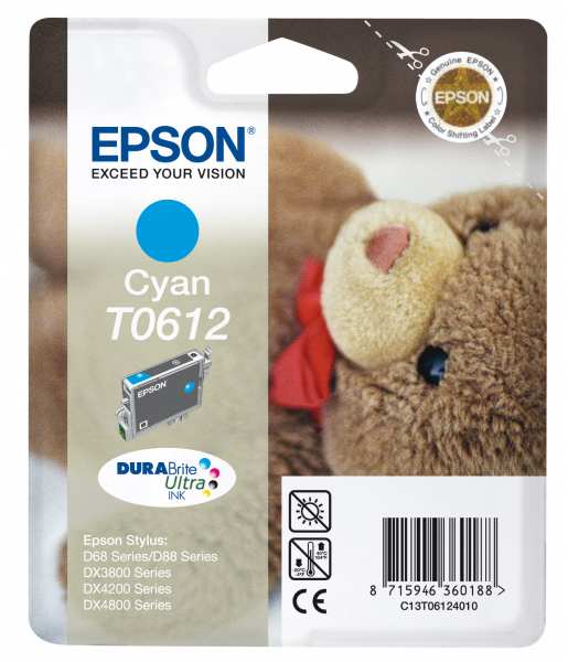 Epson Singlepack Cyan T0612 DURABrite Ultra Ink, Teddybear. Type Original, Printing colours Cyan, Brand compatibility Epson. Width 125 mm, Depth 31 mm, Height 75 mm. Pallet width 80 cm, Pallet length 120 cm, Pallet height 161 cm. Print cartridge volume (metric) 8 ml, Capacity cartridge 250 sheets