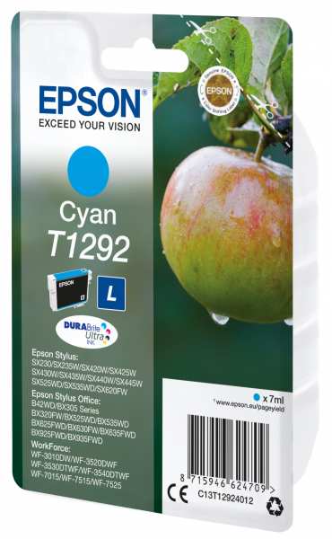 Epson Singlepack Cyan T1292 DURABrite Ultra Ink. Type Original, Printing colours Cyan, Brand compatibility Epson. Package width 145 mm, Package depth 26 mm, Package height 102 mm. Pallet width 80 cm, Pallet length 120 cm, Pallet height 15 cm