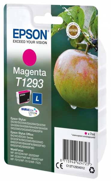 Epson Singlepack Magenta T1293 DURABrite Ultra Ink, Apple. Type Original, Ink type Pigment-based ink, Printing colours Magenta. Package width 145 mm, Package depth 26 mm, Package height 102 mm. Pallet width 80 cm, Pallet length 120 cm, Pallet height 15 cm