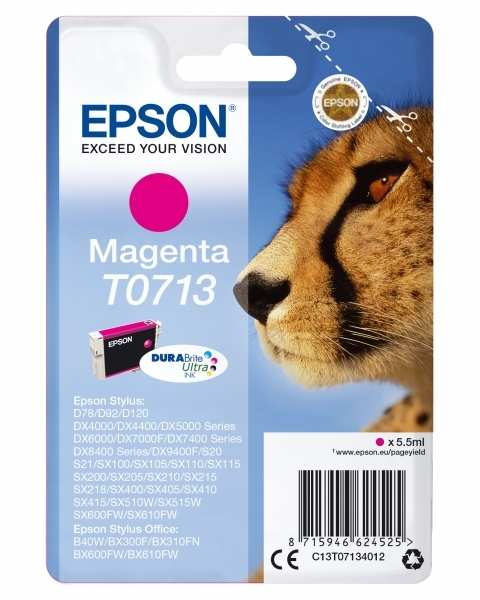 Epson Singlepack Magenta T0713 DURABrite Ultra Ink. Type Original, Ink type Pigment-based ink, Printing colours Magenta. Package type Blister