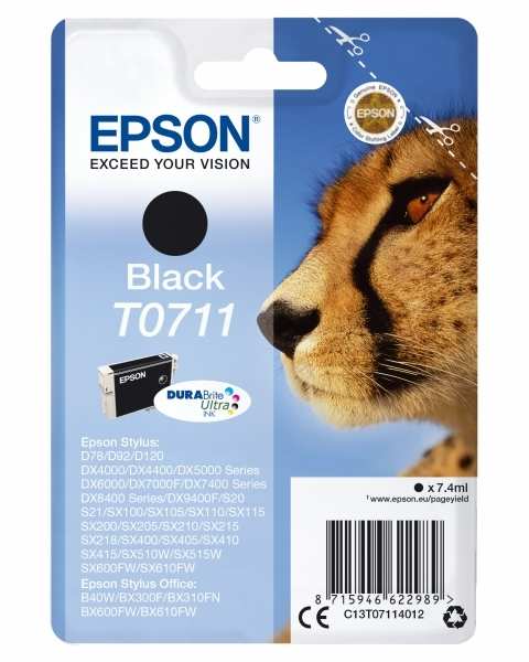Epson Singlepack Black T0711 DURABrite Ultra Ink, Cheetah. Type Original, Ink type Pigment-based ink, Printing colours Black. Package type Blister