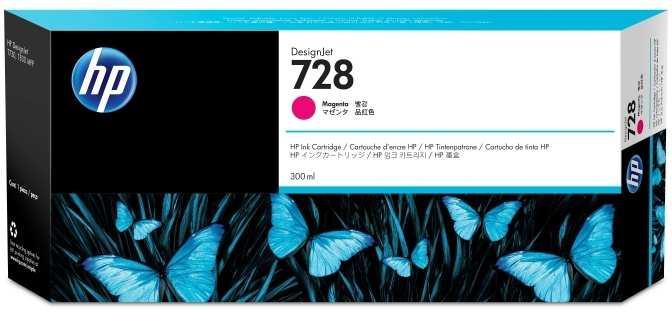 HP 728. Type Original, Ink type Dye-based ink, Printing colours Magenta. Width 283 mm, Depth 41 mm, Height 118 mm. Pallet width 101.6 cm, Pallet length 121.9 cm, Pallet height 91.9 cm