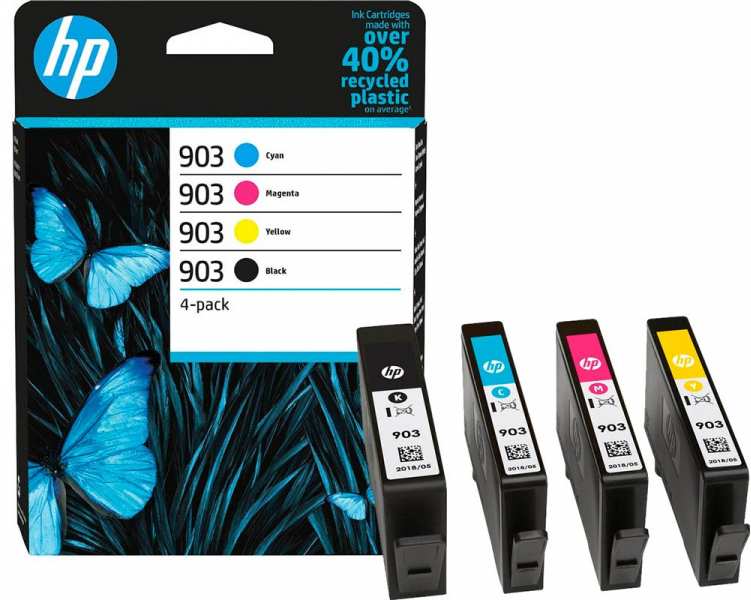 HP 903 4-pack Black/Cyan/Magenta/Yellow Original Ink Cartridges. Cartridge capacity Standard Yield, Black ink type Pigment-based ink, Colour ink type Pigment-based ink, Black ink volume 12.4 ml, Supply type Combo pack, Colour ink page yield 315 pages, Colour ink volume 4.5 ml, Quantity per pack 4 pc(s), Black ink page yield 300 pages