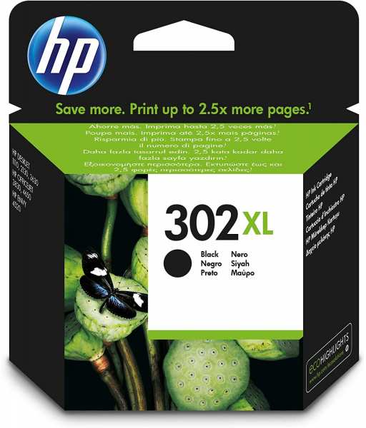 HP 302XL. Type Original, Ink type Pigment-based ink, Printing colours Black. Weight 42.3 g, Package width 113 mm, Package depth 37 mm. Country of origin Malaysia