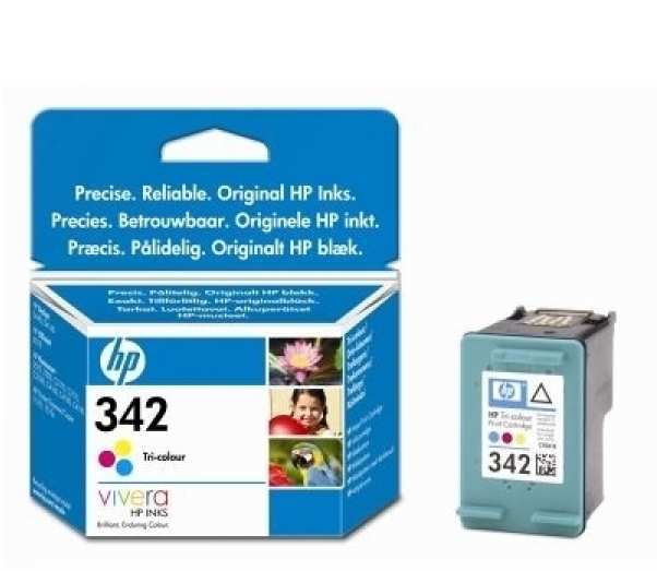 HP 342 Tri-colour Inkjet Print Cartridge with Vivera Inks. Type Original, Ink type Pigment-based ink, Printing colours Cyan, Magenta, Yellow. Weight 40 g, Package weight 70 g. Quantity per pallet 1920 pc(s), Pallet weight 146.2 kg. Package dimensions (WxDxH) 144 x 113 x 37 mm, Empty weight 27.4 g, Print cartridge volume (metric) 5 ml. Print head swath 8.38 mm (0.33)