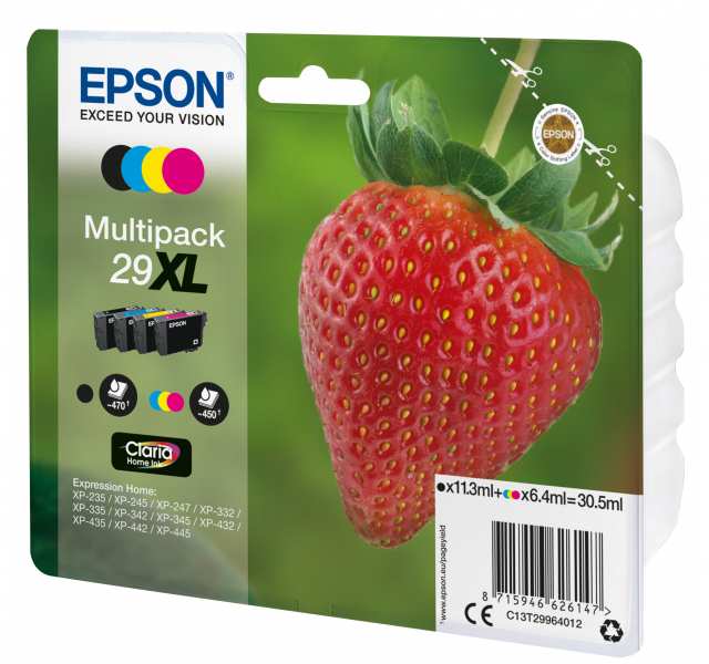Epson Multipack 4-colours 29XL Claria Home Ink, Strawberry. Type Original, Ink type Pigment-based ink, Printing colours Black,Cyan,Magenta,Yellow. Package width 170 mm, Package depth 370 mm, Package height 150 mm. Pallet width 80 cm, Pallet length 120 cm, Pallet height 36.6 cm