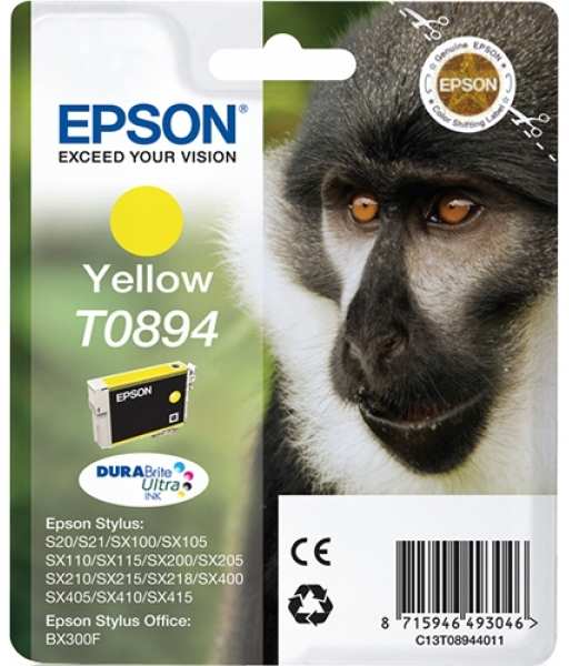Epson Singlepack Yellow T0894 DURABrite Ultra Ink, Monkey. Type Original, Ink type Pigment-based ink, Printing colours Yellow. Package width 145 mm, Package depth 26 mm, Package height 120 mm. Pallet width 80 cm, Pallet length 120 cm, Pallet height 43.6 cm