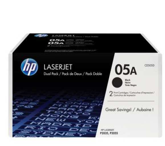 HP 05A 2-pack Black Original LaserJet Toner Cartridges. Black toner page yield 4600 pages, Printing colours Black, Quantity per pack 2 pc(s)