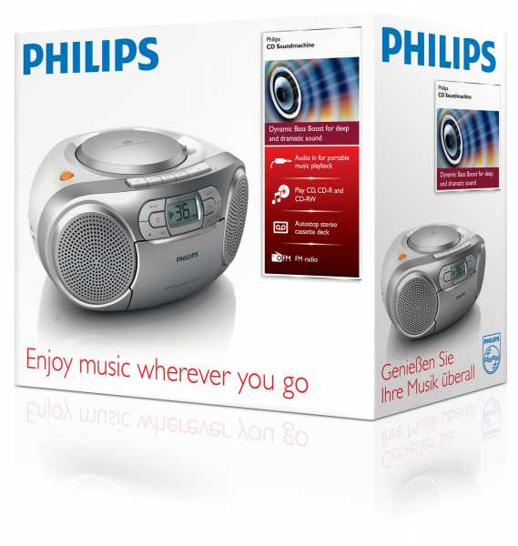 Philips CD Soundmachine AZ127/12. Audio system stereo, Sound enhancement technology Dynamic Bass Boost. RMS rated power 2 W. Supported radio bands FM. Device type Portable CD player, Product colour Grey, Cassette deck technology Mechanical. Display LCD