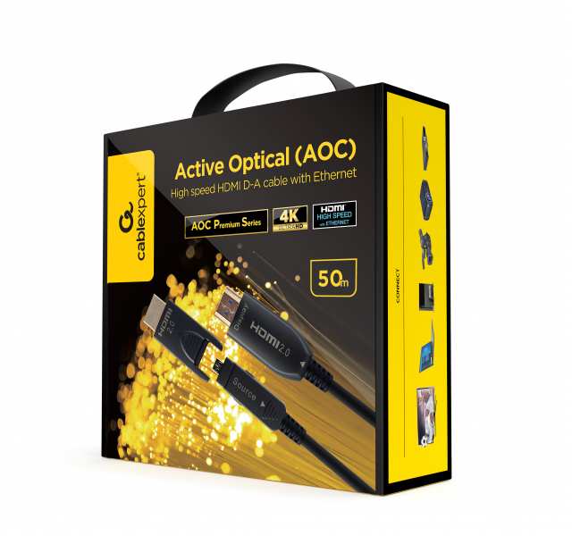 Gembird CCBP-HDMID-AOC-50M. Cable length 50 m, Connector 1 HDMI Type D (Micro), Connector 1 gender Female, Connector 2 HDMI Type A (Standard), Connector 2 gender Female, Connector contacts plating Gold, Data transfer rate 16 Gbit/s, Product colour Black
