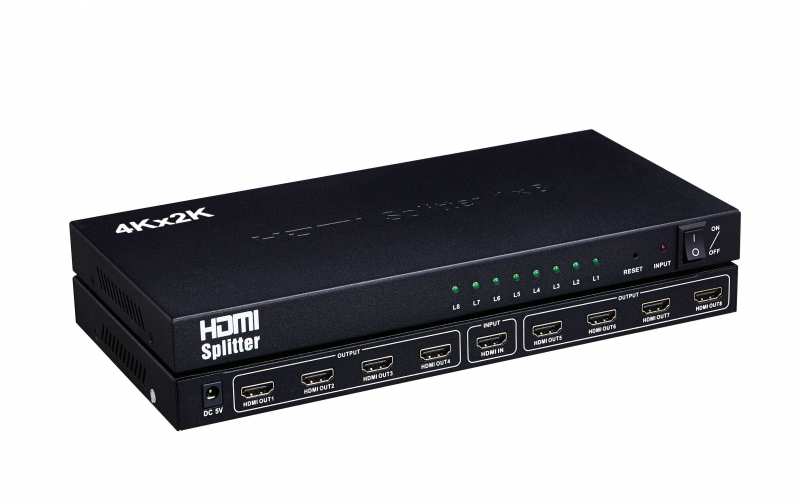 An HDMI splitter with one HDMI input and four outputs. This allows you to display the specified graphic source on four different displays. It allows one HDMI device to be split easily to eight HDMI compatible monitors or projectors. Compatible with most HDMI devices such as monitors, TVs, computers, gaming consoles, BluRay and DVD players, projectors and many more. In addition, it can be placed at the end of a long HDMI cable to regenerate the HDMI signal. The resolution of this HDMI splitter can be up to 3840x2160/30Hz.