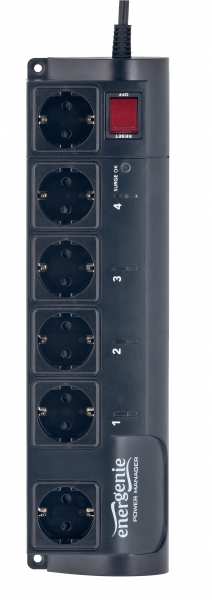 Gembird EG-PMS2. Surge energy rating 375 J, AC outlets quantity 6 AC outlet(s), AC outlet types Type F. Product colour Black. Cable length 1.8 m, Weight 1.3 kg, Width 400 mm. Number of products included 1 pc(s)